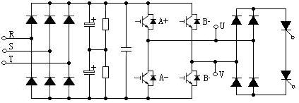 每个功率单元结构上完全一致,可以互换,其主电路结构如图所示,为基本的交-直-交双向逆变电路,图中通过逆变块IGBT反并联的二极管构成三相全桥方式整流,整流后的给滤波电容充电,确定母线电压, 通过对IGBT逆变桥进行正弦PWM控制实现双向逆变。