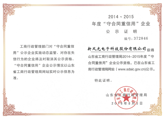 9月7日,JN江南体育官方网站电子科技股份有限公司收到由山东省工商行政管理局下发的2014-2015年度山东省“守合同重信用”企业公示证明,山东省“守合同重信用”企业这一称号是目前全省诚信经营方面的荣誉。JN江南体育官方网站公司继2012-2013年度获得山东省“守合同重信用”企业后,再度获得该项殊荣。