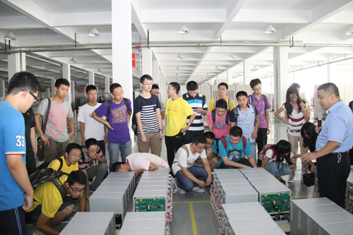 公司技术中心负责人带领学生们深入车间参观了解高压变频器、高压动态无功补偿产品和变流器等三大主导产品的生产、装配、检测等各个工艺流程。公司先进生产线的车间让同学们眼前一亮,面对众多先进的生产、检测、试验仪器设备,使得同学们驻足观看,不时询问。并对JN江南体育官方网站公司规模的不断发展壮大、蒸蒸日上的强劲发展势头赞叹不已。