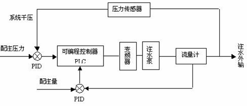本系统中,一方面在泵出口管线上安装一只高可靠性压力传感器,将实测的压力信号与系统的配注压力(期望值)相比,并将其差值送往过程参数调节器( PID )进行比例和积分运算,最后将输出结果送给可编程控制器( PLC );另一方面在泵入口管线上安装一只流量计,用于监测系统实际总流量,将该值与系统配注量的差值再进行一次 PID 整定,最后将输出结果送给 PLC 。 PLC 根据所接收的两个 PID 整定信号,利用模糊推理的方法,在满足系统干压的前提下,系统及时自动调整高压变频器的输出频率从而控制变频泵的转速。由离心泵原理知,泵转速的变化可引起相应的排量变化,通过频率的变化以达到期望的排量值。通过上述闭环控制,使系统的实际压力和排量与系统的配注压力和配注量相接近。系统设计为闭环控制系统,流量和压力为系统的两个主要参数,将系统实测的流量和压力信号与地质要求的流量和压力(期望值)进行双 PID 调节;通过模糊推理的方法自动寻优控制,根据推理结果,系统及时自动调整高压变频器的输出,并自动计算出变频器的较佳运行频率。