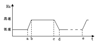 高炉生产为周期性间断出铁,高炉在出铁时,产生大量棕红色烟尘,此时要求风机高速运行;在不出铁时,产生烟尘相对较少,只需要很低的转速。利用变频器根据高炉实际需要对除尘风机进行变频调速控制,既保证和改善了工艺,又达到了节能降耗的目的。出铁时,变频器高速运行,高速定为45HZ(可调);不出铁时,变频器低速运行,低速定为20Hz(可调)。用户的风机型号为 Y4-73,电机型号为 Y 560-3-8 。高炉除尘风机工艺要求曲线如图4。