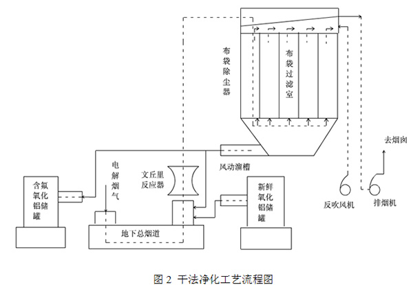 (2)吸附反应。将吸附剂新鲜的氧化铝粉加入到电解烟气中,并使之与烟气充分接触而吸附烟气中的氟化氢,然后送到布袋除尘器袋滤室。