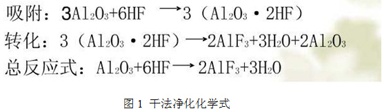 干法净化就是以某种固体物质吸附另一种气体物质所完成的净化过程。具有吸附作用的物质称吸附剂,被吸附的物质叫吸附质。铝电解含氟烟气的干法净化使用电解铝生产用的氧化铝,作为吸附剂吸附烟气中的氟化氢等大气污染物来完成对烟气的净化。氧化铝对氟化氢的吸附过程分三个步骤: