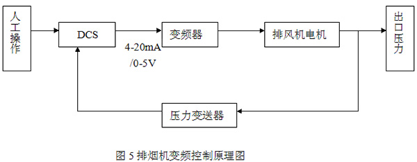 如图5所示,检测排烟风机出口烟气压力,因为当内外压差太大时,布袋除尘器中的烟气没有被除掉,就被直接吸出,影响净化效果。为了保证烟气净化过程顺畅进行,DCS接受压力变送器传输过来的压力信号,按照既定算法进行计算。当压力超过系统设定值时,DCS发出4-20mA或0-5V的信号来降低变频器的频率,实现排风机降速运行来降低出口烟气压力;当压力低于系统设定值时,DCS发出4-20mA或0-5V的信号来升高变频器的频率,实现排风机升速运行来升高出口烟气压力。
