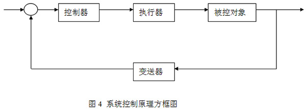 根据工艺流程,在本系统中,被控对象是核心,被测信号经变送器转换成标准信号(4-20mA或0-5V),与给定值进行比较,并对结果进行调节运算,以输出作为控制信号,经执行器实现对被控对象的调节。控制系统方框图如图4所示: