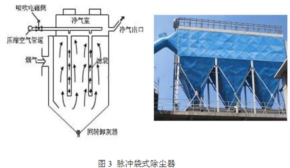 (2)脉冲袋式除尘器,如图3所示,含尘气体从袋式除尘器进口引入后,通过烟气分配装置均匀进入滤袋,在此过程中粉尘即被滤袋的外侧所阻挡,经过净化处理的气体从出口排出,当滤袋表面的粉尘不断增加到一定的厚度,导致设备阻力上升到设定值时,微压差控制信号有信号输出。控制仪发出信号,使喷吹系统工作,电磁脉冲阀打开,此时压缩空气从气包顺序经脉冲阀和喷嘴向滤袋内喷射,附于袋外的粉尘脱离滤袋落入灰斗,然后由回转排灰阀将粉尘排出。