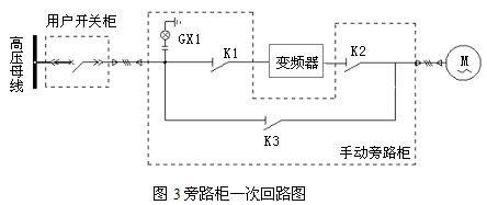 图3手动旁路柜中,共有3个高压隔离开关,为了确保不向变频器输出端反送电,K2与K3采用电磁互锁操动机构,实现电磁互锁。当K1、K2闭合,K3断开时,电机变频运行;当K1、K2断开,K3闭合时,电机工频运行,此时变频器从高压中隔离出来,便于检修、维护和调试。
