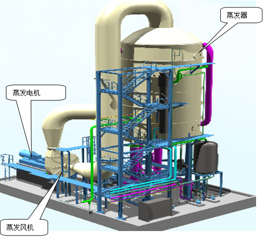 蒸发风机的主要作用是将注入蒸发器的废液蒸汽回收然后再送入散热片中起到增压升温的作用,需要说明的是,在蒸发风机开启之前,需要补给新鲜蒸汽当温度达到96℃以上时就可以开启蒸发风机,达到自循环关闭新鲜蒸汽起到节约的作用。其蒸发的冷凝液经过冷却后又可被回收利用,从而节约了清水资源。