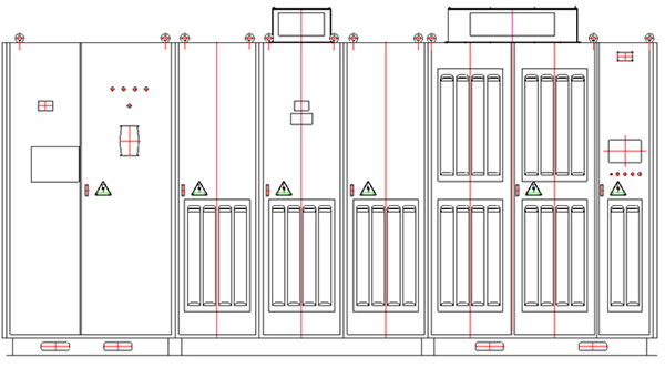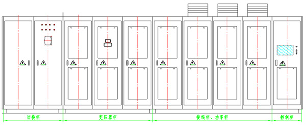 设计之初,为保证产品的可靠性、稳定性,采用双重冗余设计的模式,即加大了单元的数量,也增大了各器件的选型。10kV采用每相10个单元或13个单元,6kV采用每相6个单元或8个单元;功率器件选型余量大至2.5倍甚至3倍,电解电容选择90-120UF/A,变压器铁芯、风机风量选型都不同程度的大一规格。其排布则延续传统的排布模式,即从左往右依次为切换柜、变压器柜、(接线柜)、功率柜、控制柜的模式,其外形如图(1):