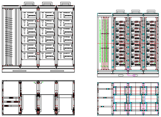 随着高压变频器市场规模的不断扩大,用户对变频的苛求也越来越严格。作为产品开发商,也不断为提升产品质量与档次作着不懈努力,所用柜体也由原来的单一种类向更宽范方向发展,其产品功能、质量与外形都在不断升级。同规格变频器原体积如图(4)。其单元结构排布也有了更新的认知,由于原来每相竖排所用电缆多、结构复杂、附加成本大,便改为每相单元横排,使变压器次级引线分别对应A、B、C三相,不再有接线柜,直接通过电缆托板到达各单元,不再迂回,其控制柜也由原来的600mm转为400mm。另一个飞跃则是每相单元数量的减少,如10kV改为8单元/相,6kV改为5单元/相。功率单元数量少了,其整机质量并没有受到影响,相反其故障点却相应减少,加之电路结构上星点漂移技术的应用,使得变频器性能更加优越。功率柜具体排布情况,6kV5个单元,每相横向分布,上、中、下三相如图(5)所示。10kV如果采取单元前后放置,每相前4后4,如图(6)所示: