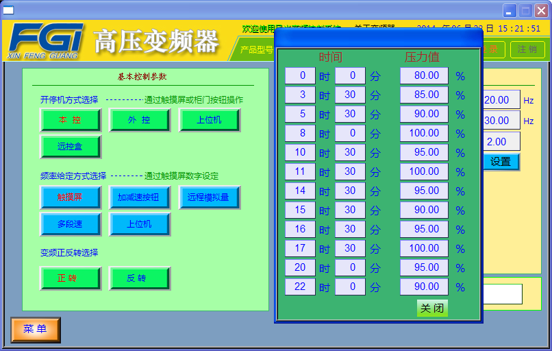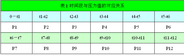 变频器人机界面在运行中根据实际运行时间自动按照设置好的压力值赋值到主控,然后变频器主控将运行频率调整至该压力值对应的频率,时间段与压力值的对应关系如表1所示。