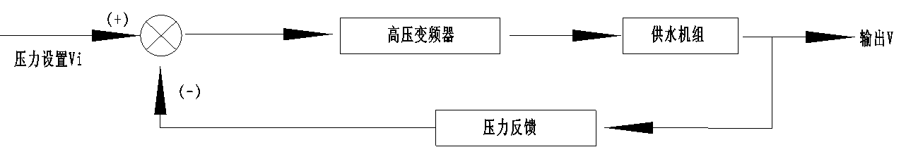 为满足不同时段不同地区的用水压力需求,该水厂采用先进的恒压供水控制系统,可以对水厂出口处的水压值V进行精确的处理和控制,并与压力设置值Vi构成闭环控制系统。恒压供水系统原理如图2所示。变频器内部的主控DSP采集供水压力值V与用户给定值Vi进行比较和运算,通过PID进行调整,将结果转换为频率调节信号送至变频器,直至达到供水压力的给定值Vi。不管系统供水流量如何变化,供水压力值V始终维持在给定压力值Vi附近。