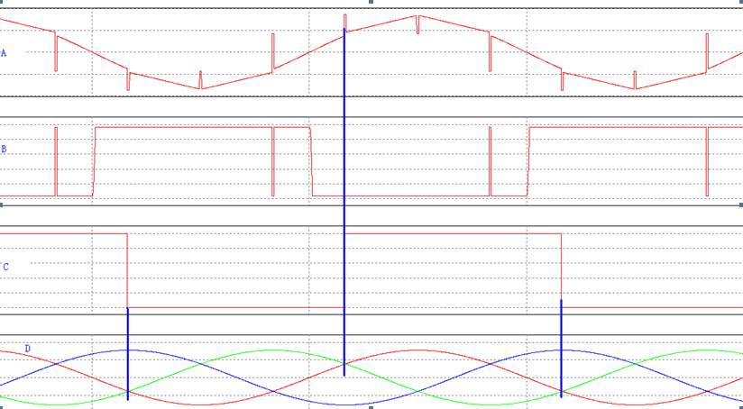 在这个电路中通过光耦TA、TB、TC的次级就可以获取三相的过零信号,但在反向整流工作中仍然由于电源缺口在光耦次级会有比较窄的过零脉冲,但是完全可以通过CPLD适当的处理去掉,如图3中的蓝色,没有经过CPLD处理时获取的信号: