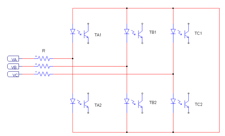由于反向整流要求同步信号有比较高的对称波形,上面的电路中只是取到了相电压的大于零的部分,但由于光耦和二极管的压降存在,可能会使得不对称的情况产生,所以如果要正负半周对称,可以考虑使用6个光耦来产生信号,如下图: