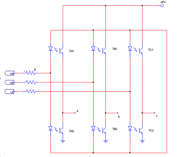 对于上述情况考虑采用光耦来获取同步信号的过零点,这样就可以不用考虑三相中点电位问题,又能够获取相电压的过零点,初步方式如图2所示: